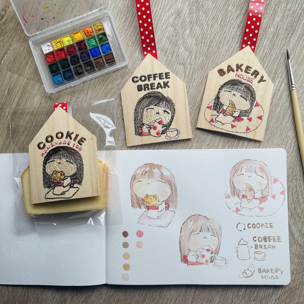 งานปัก ดีไซน์เพื่อเป็นส่วนตกแต่งแพคเกตเบเกอรี่ และขนมต่างๆ 8 ดีไซน์ สามารถปักบนไม้บัลซา และวัสดุต่างๆได้ มีวีดีโอวิธีทำสอน