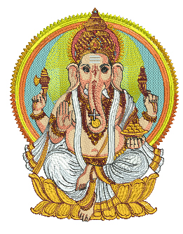 ลายปักพระพิฆเนศขนาดใหญ่ ใช้สีด้ายหลายสี มีสีสันสวยงาม ปักไว้สำหรับบูชา เพื่อเป็นสิริมงคล
